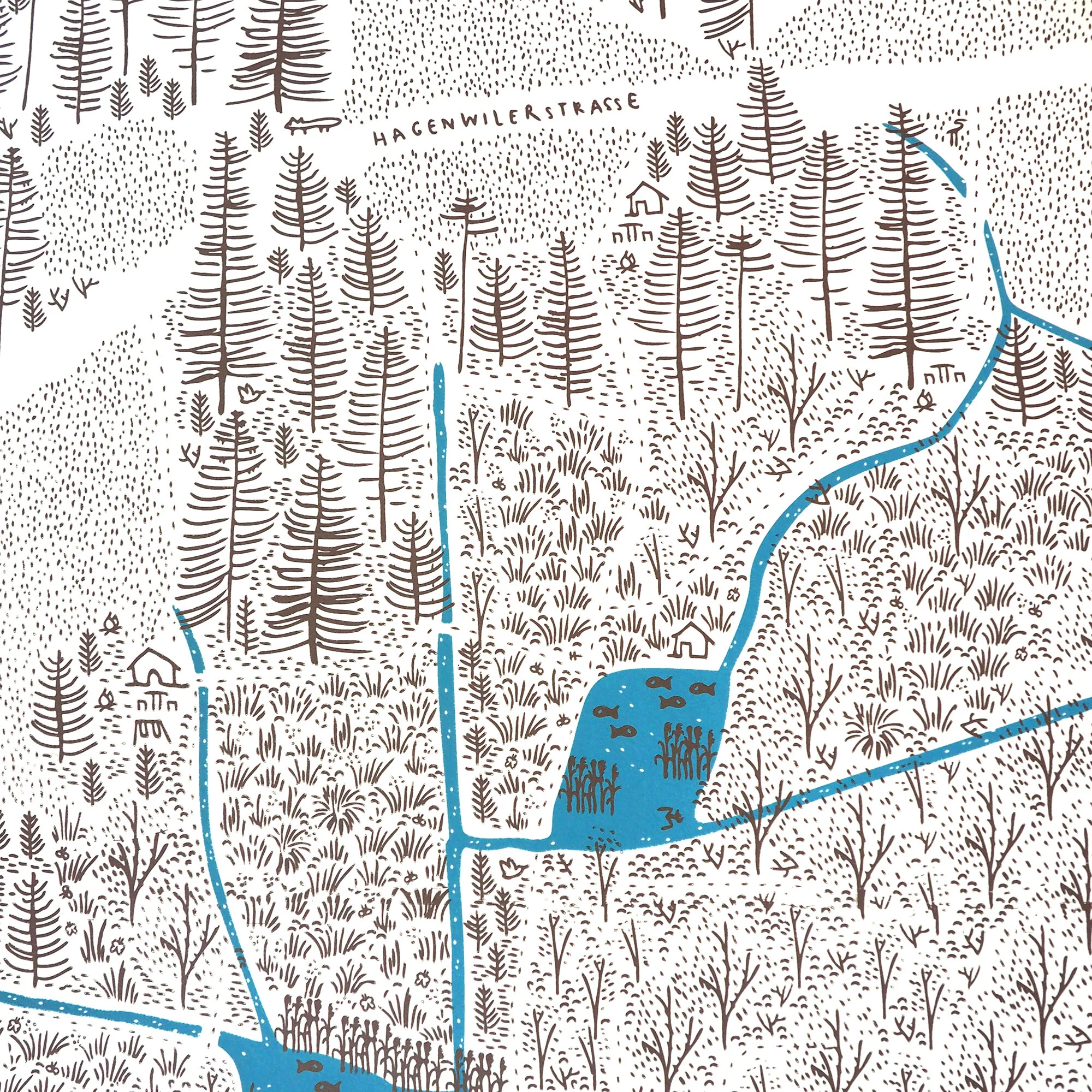 Cropping of the new illustrated map of Hudelmoos. Printed by Zitropress.